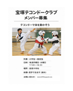 場所:韓国民団宝塚支部(伊孑志4丁目自治会館)対象:幼児~社会人、親子での参加OK(男女)活動日:金曜日16:15-21:00